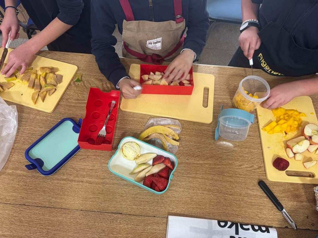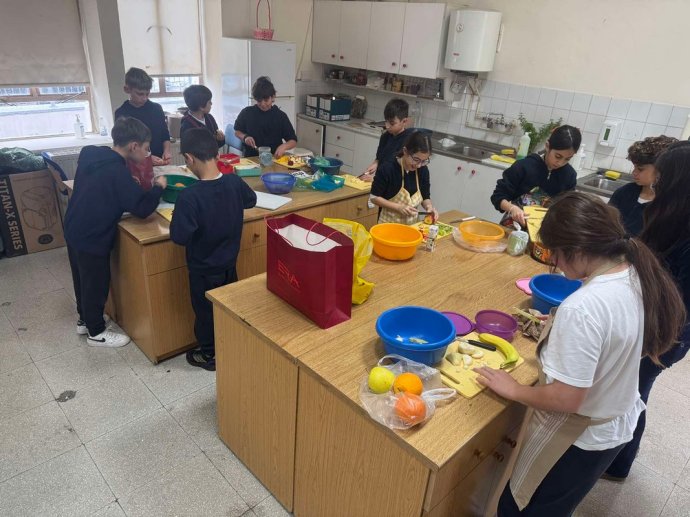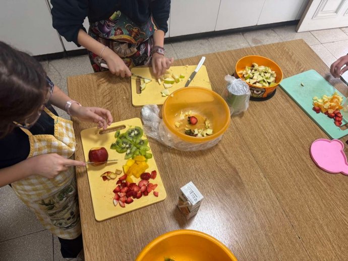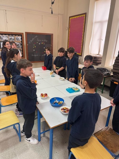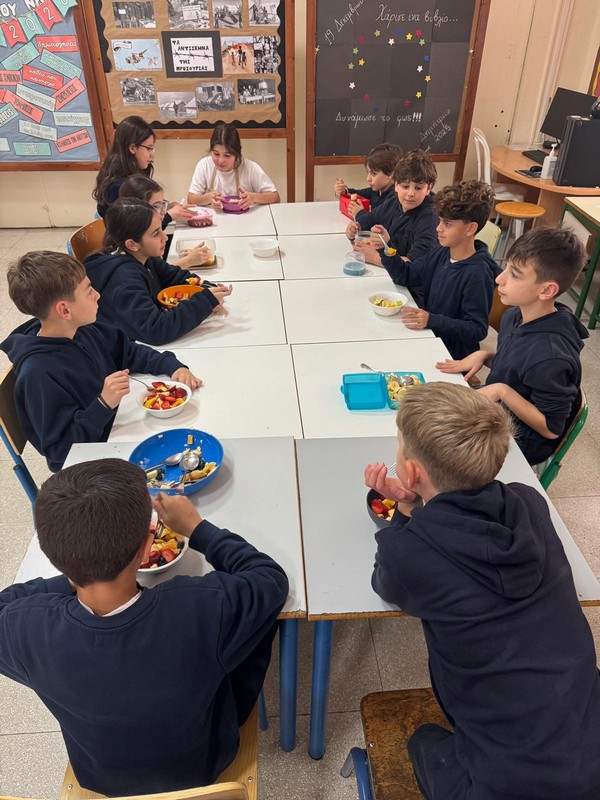 Οι μαθητές και οι μαθήτριες έφεραν φρέσκα φρούτα και ετοίμασαν όλοι μαζί μια νόστιμη και πολύχρωμη φρουτοσαλάτα, εφαρμόζοντας βασικούς κανόνες υγιεινής.