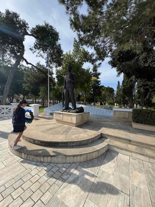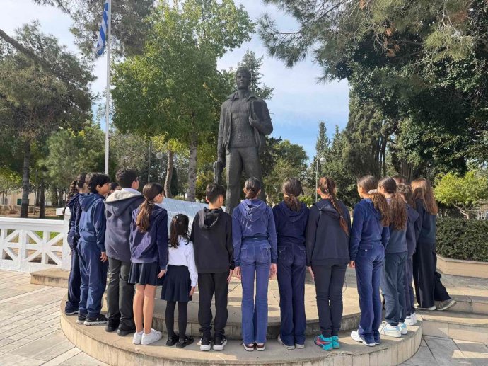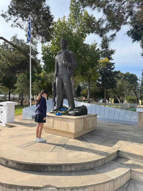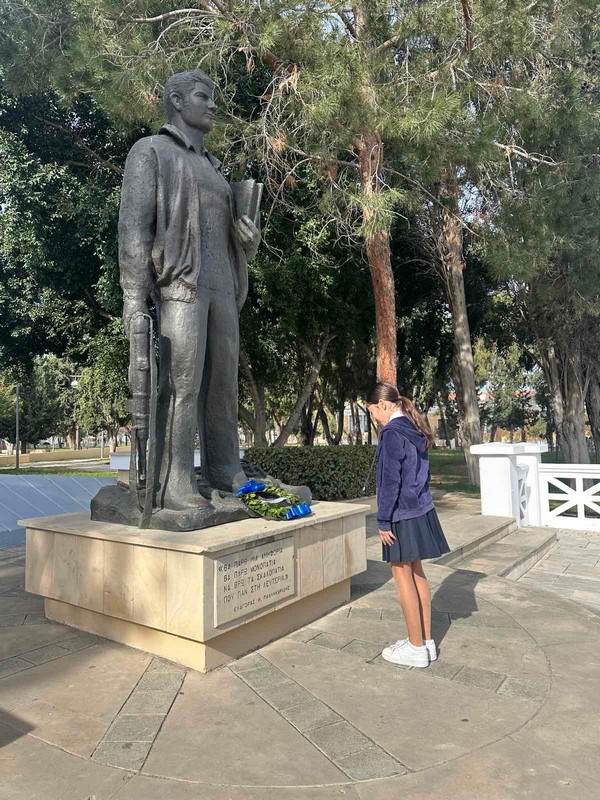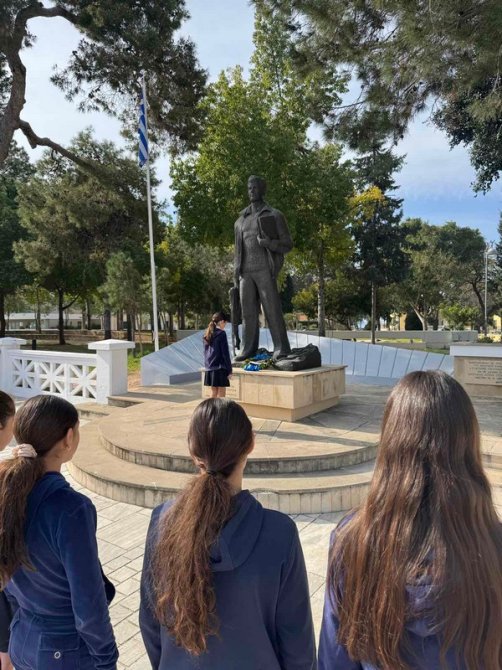 Στη συνέχεια, τα μέλη του Συμβουλίου κατέθεσαν στεφάνι στον ανδριάντα του ήρωα που βρίσκεται κοντά στο σχολείο μας, αποτίοντας φόρο τιμής στη θυσία και την προσφορά του για την ελευθερία της πατρίδας μας.
