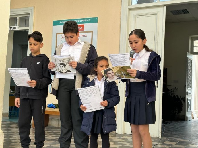 Την Παρασκευή, 13 Μαρτίου 2026, με την ευκαιρία της επετείου της θυσίας του ήρωα Ευαγόρα Παλληκαρίδη, το Κεντρικό Μαθητικό Συμβούλιο του σχολείου μας παρουσίασε σε συγκέντρωση των παιδιών τη ζωή και τη δράση του νεαρού αγωνιστή.